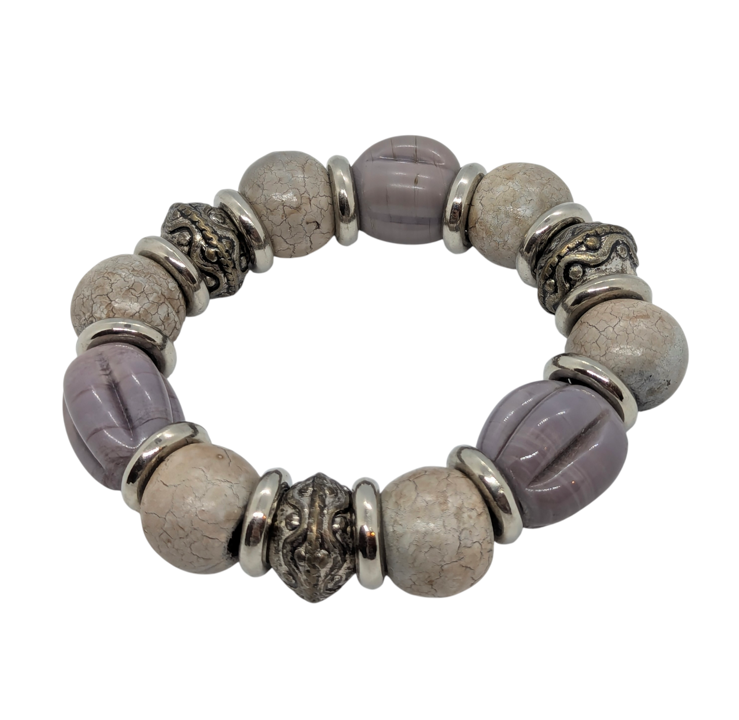This bracelet features a warm, calming palette of creamy beige, taupe, and translucent lavender beads, alternating in size and texture. Crackled faux-stone rounds and mauve oval beads are interspersed with smooth and patterned silvertone spacers, adding contrast and dimension. The overall tone is soft, earthy, and highly wearable — ideal for layering or as a standalone accessory.