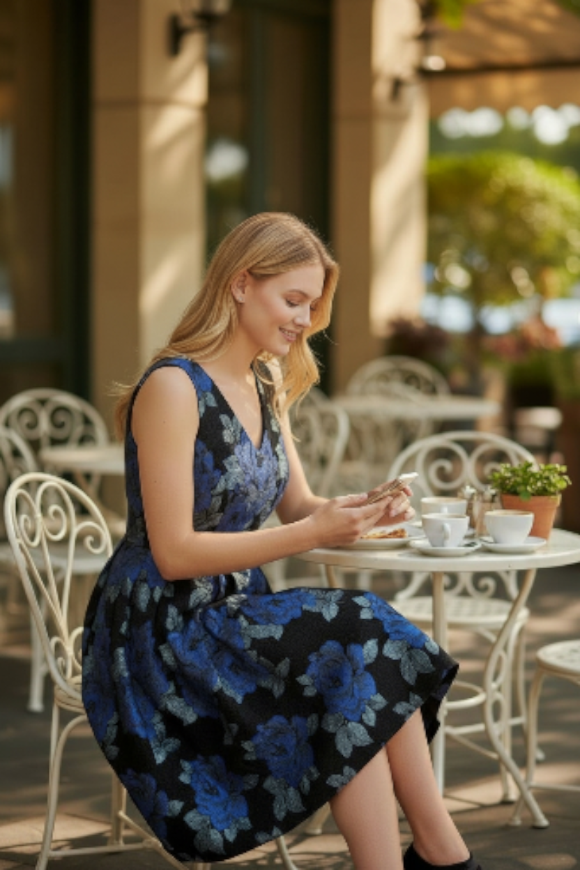 louche, luxe, courtland, jacquard dress, floral dress, eveningwear, cocktail dress, 2010s fashion, womenswear, sleeveless dress, black blue dress, brocade style, dress, jacquard, floral