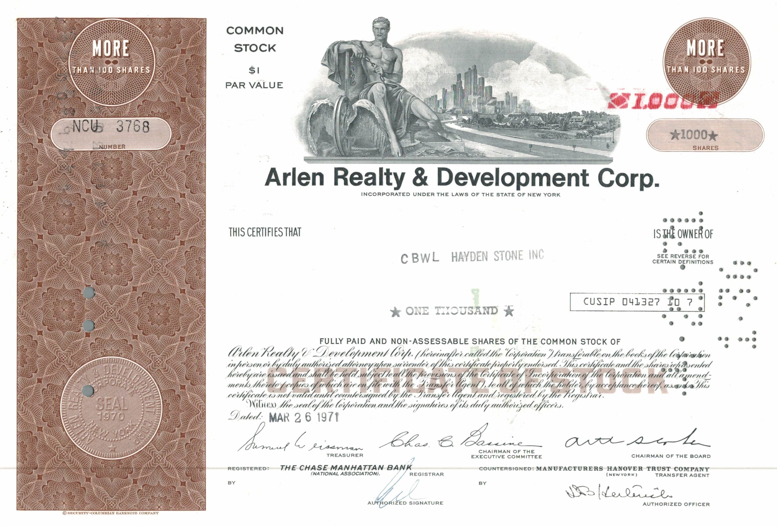 Arlen Realty & Development Corp Share Certificate 1971 – 1000 Shares