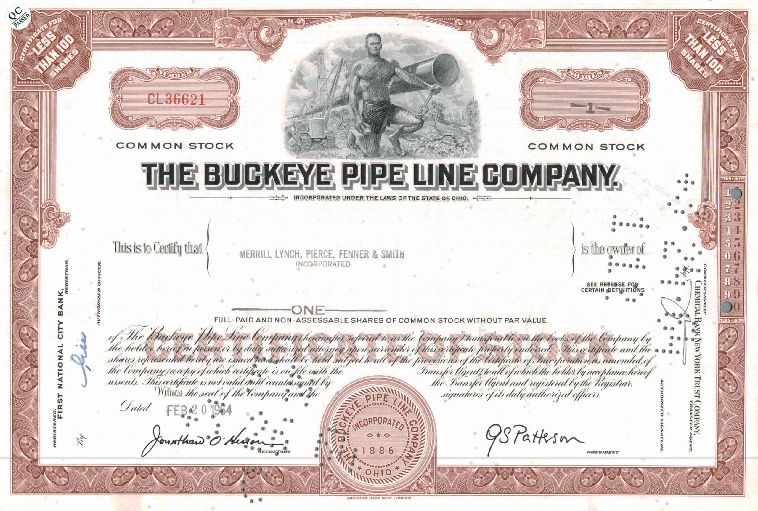 Rich with the imagery of American industry and progress, this 1964 stock certificate from the Buckeye Pipe Line Company stands as a powerful example of corporate artistry and economic history. The classical engraved vignette features a muscular worker carrying a steel pipe — a visual tribute to the might of America’s mid-20th-century energy and manufacturing sectors.