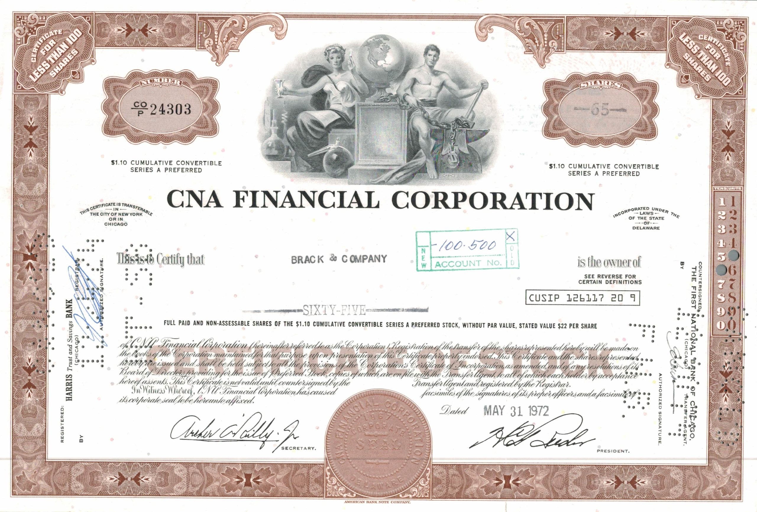 1972 certificate for 65 cumulative convertible preferred shares in CNA Financial Corporation, featuring allegorical science and industry engraving. Issued to Brack & Company and cancelled in 1974.