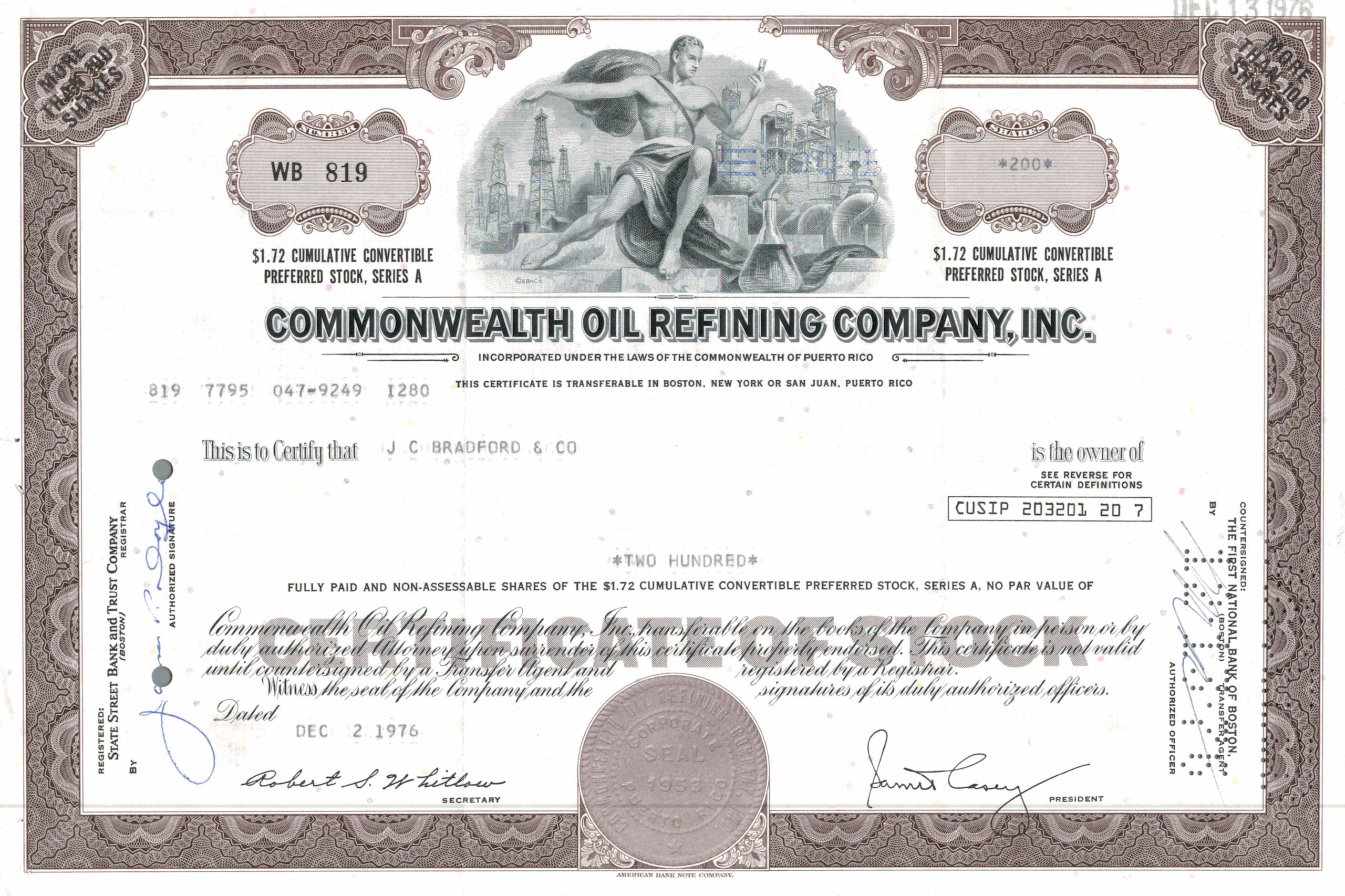 commonwealth oil, share certificate, puerto rico, 1970s, energy, preferred stock, american bank note, refinery, convertible