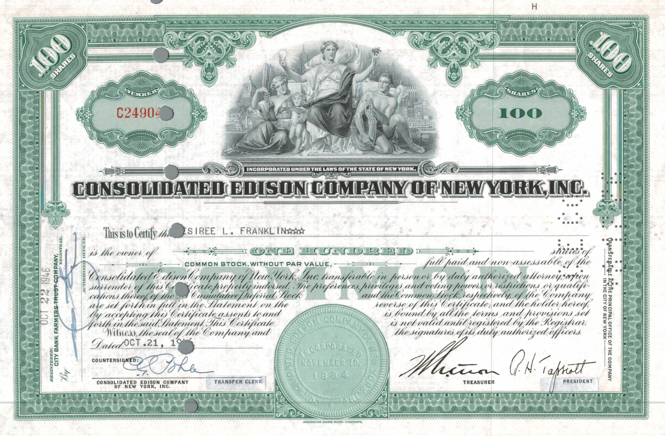 1946 stock certificate for 100 shares in Consolidated Edison Company of New York, featuring classical allegorical engraving. Issued to Disiree L. Franklin and cancelled.