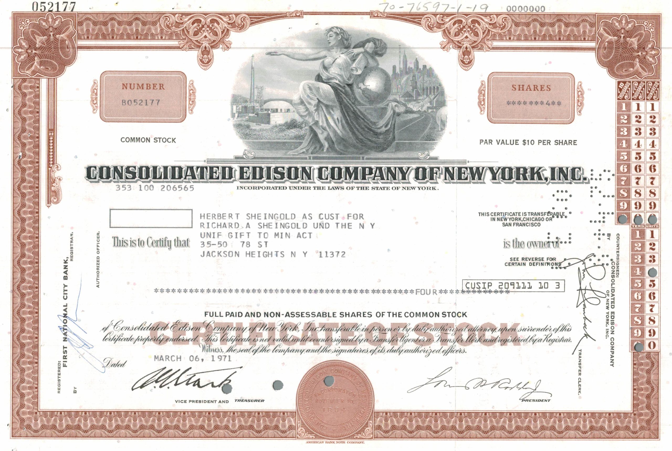 Consolidated Edison Company of New York Share Certificate 1971 – 4 Shares