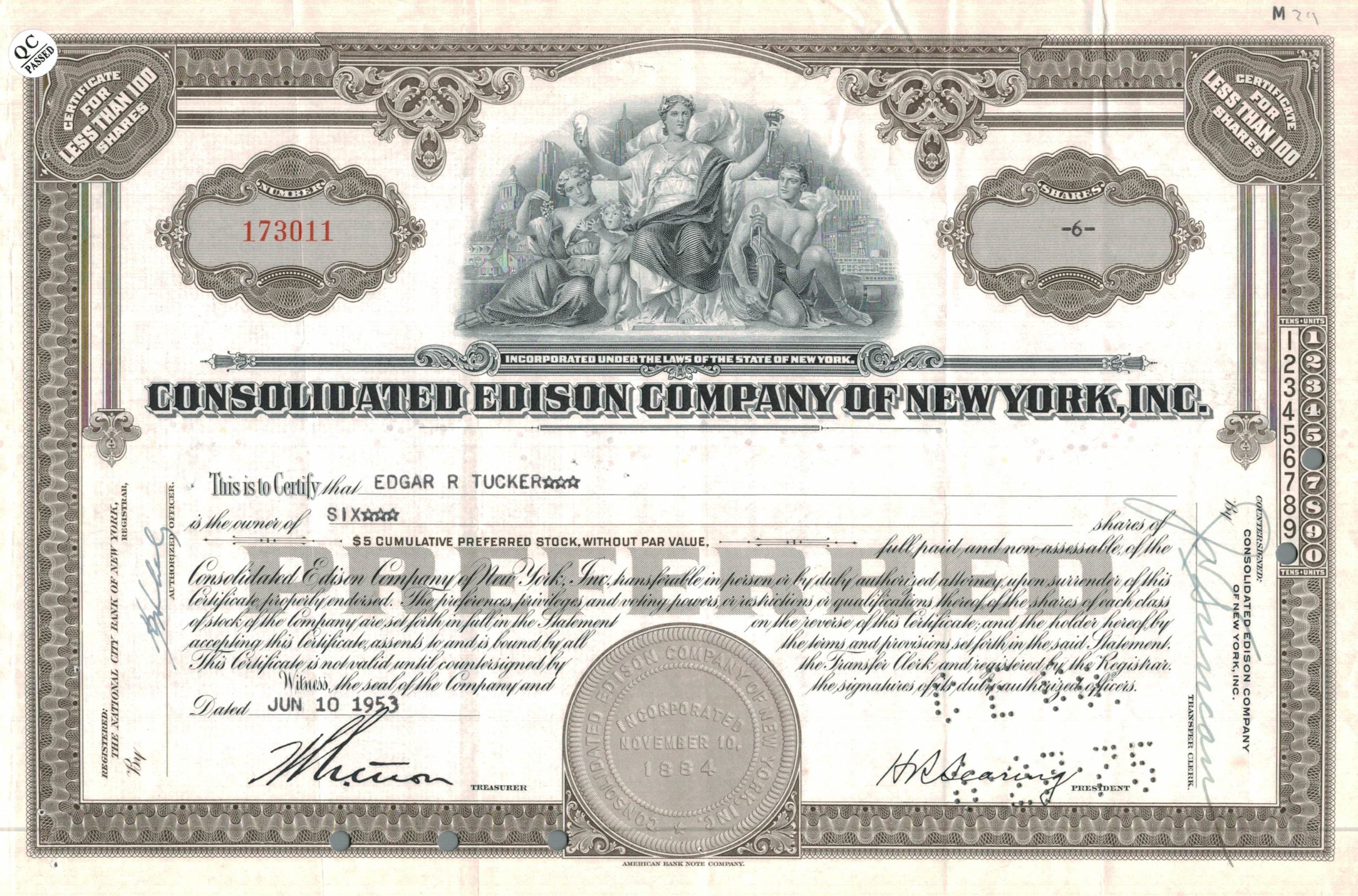Consolidated Edison Company Share Certificate 1953 New York Utility Stock
