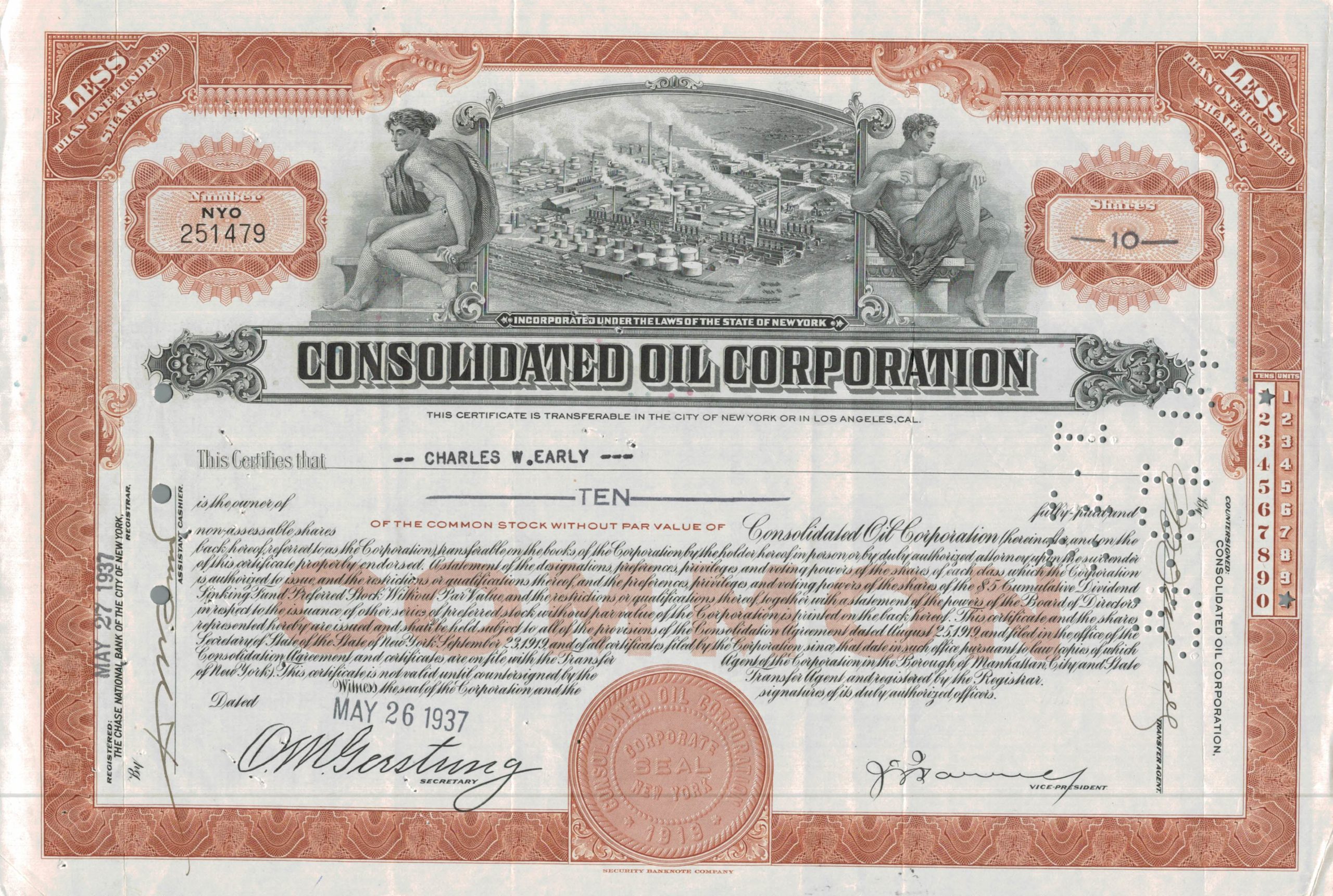 Original 1937 certificate for 10 shares in Consolidated Oil Corporation, featuring industrial allegorical vignettes and intricate early 20th-century engraving.