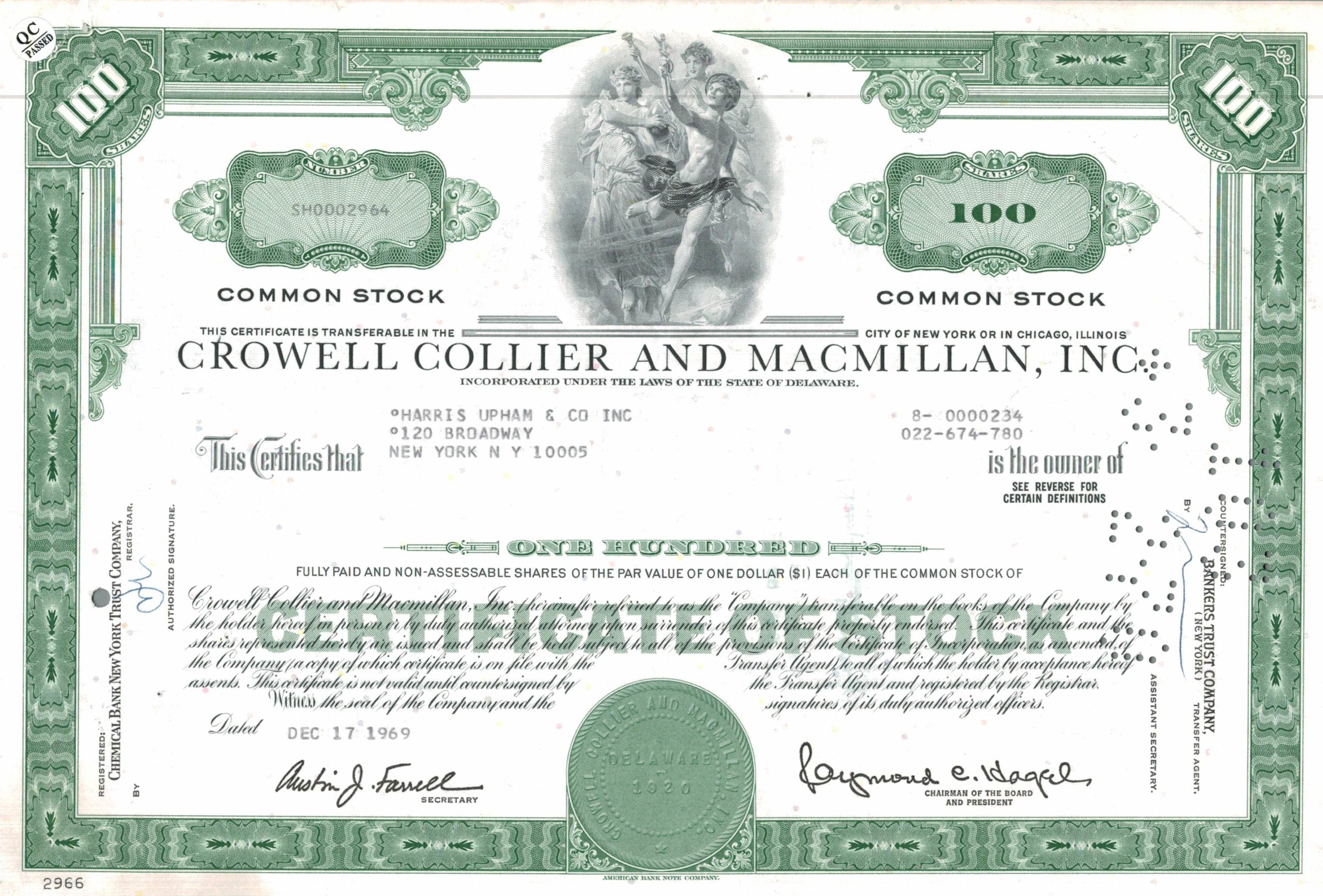 Crowell Collier and Macmillan Inc Share Certificate 1969
