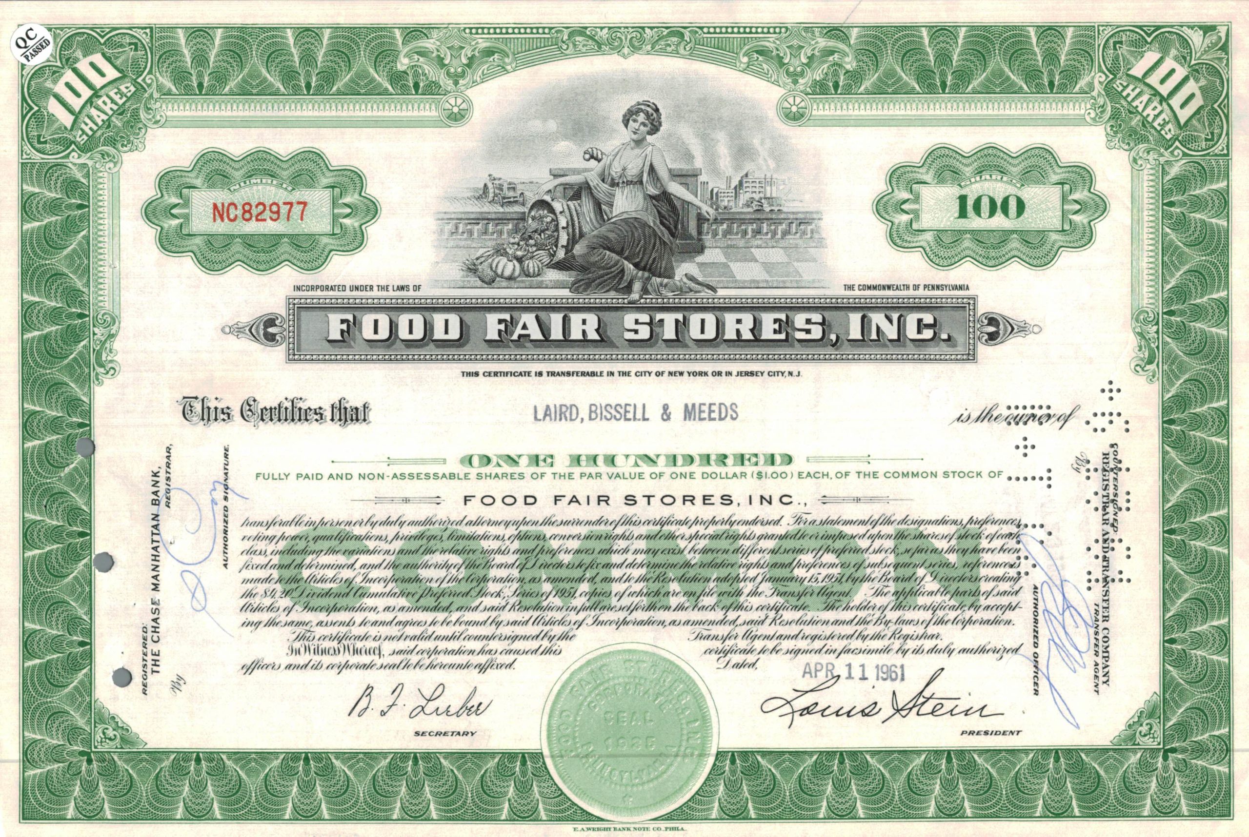 Food Fair Stores Inc. Stock Certificate, 1961