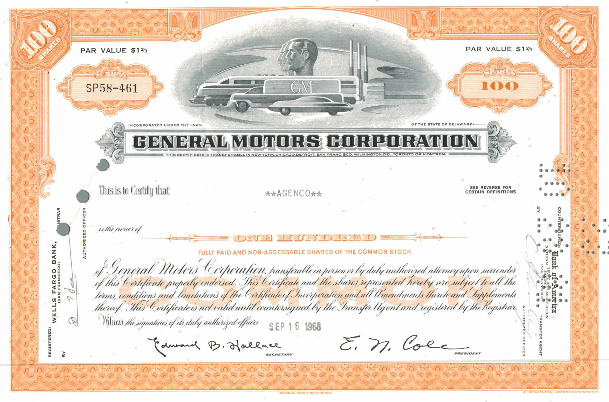 vintage automotive stock certificates, american banknote printing, general motors corporate history, 1960s industrial design ephemera, classic american car industry