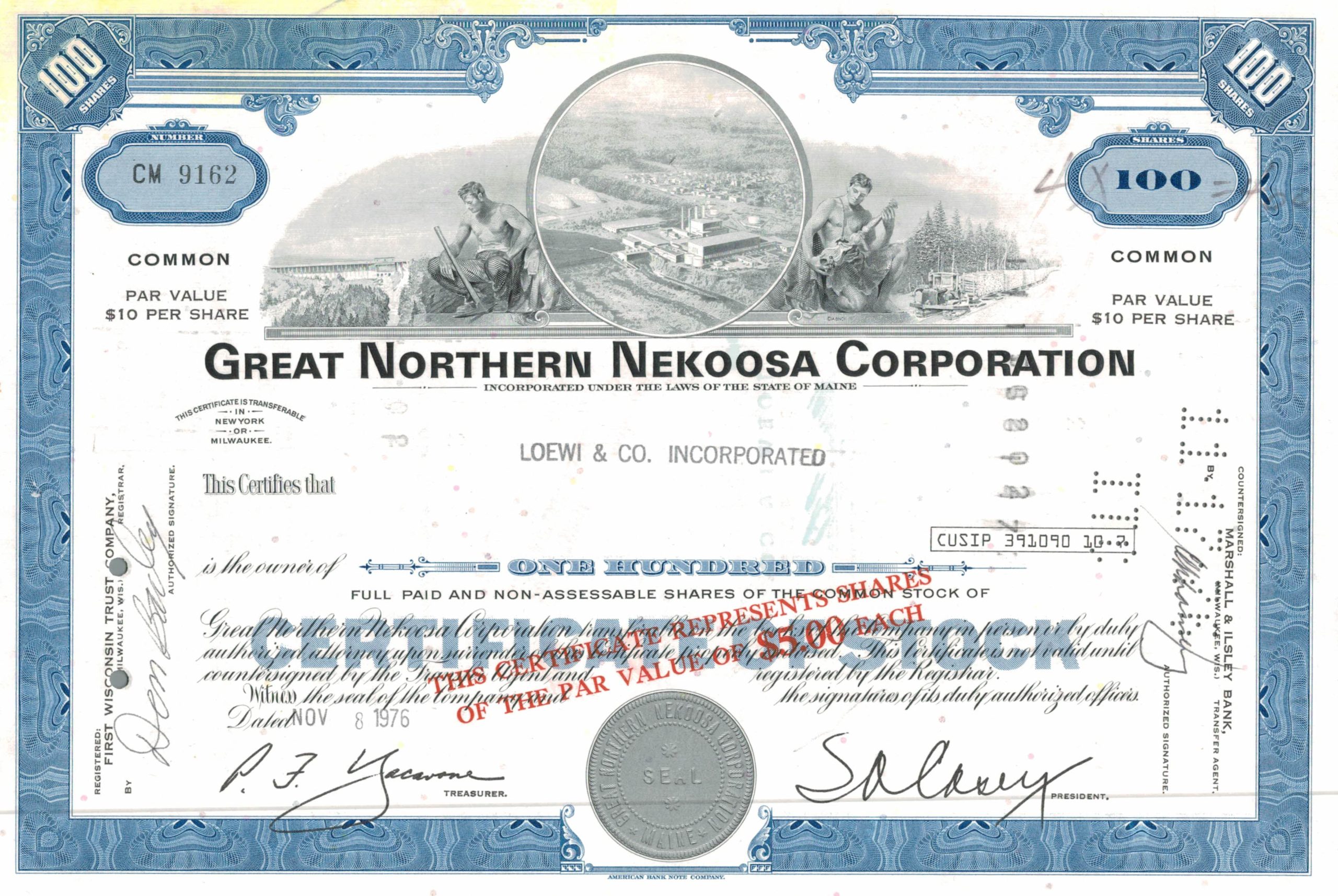 This richly engraved certificate is bordered in deep cornflower blue, with corner cartouches denoting 100 shares and an engraved scene of the Great Northern Nekoosa facility at centre. On either side, allegorical male figures represent surveying and forestry, underscoring the company’s role in American paper and timber production. The central vignette showcases a mill complex in a woodland setting, symbolising the balance between industry and natural resources. Issued on November 8, 1976, and validated by an embossed Maine corporate seal, the piece is marked with red overprint denoting a par value of $5.00 per share.