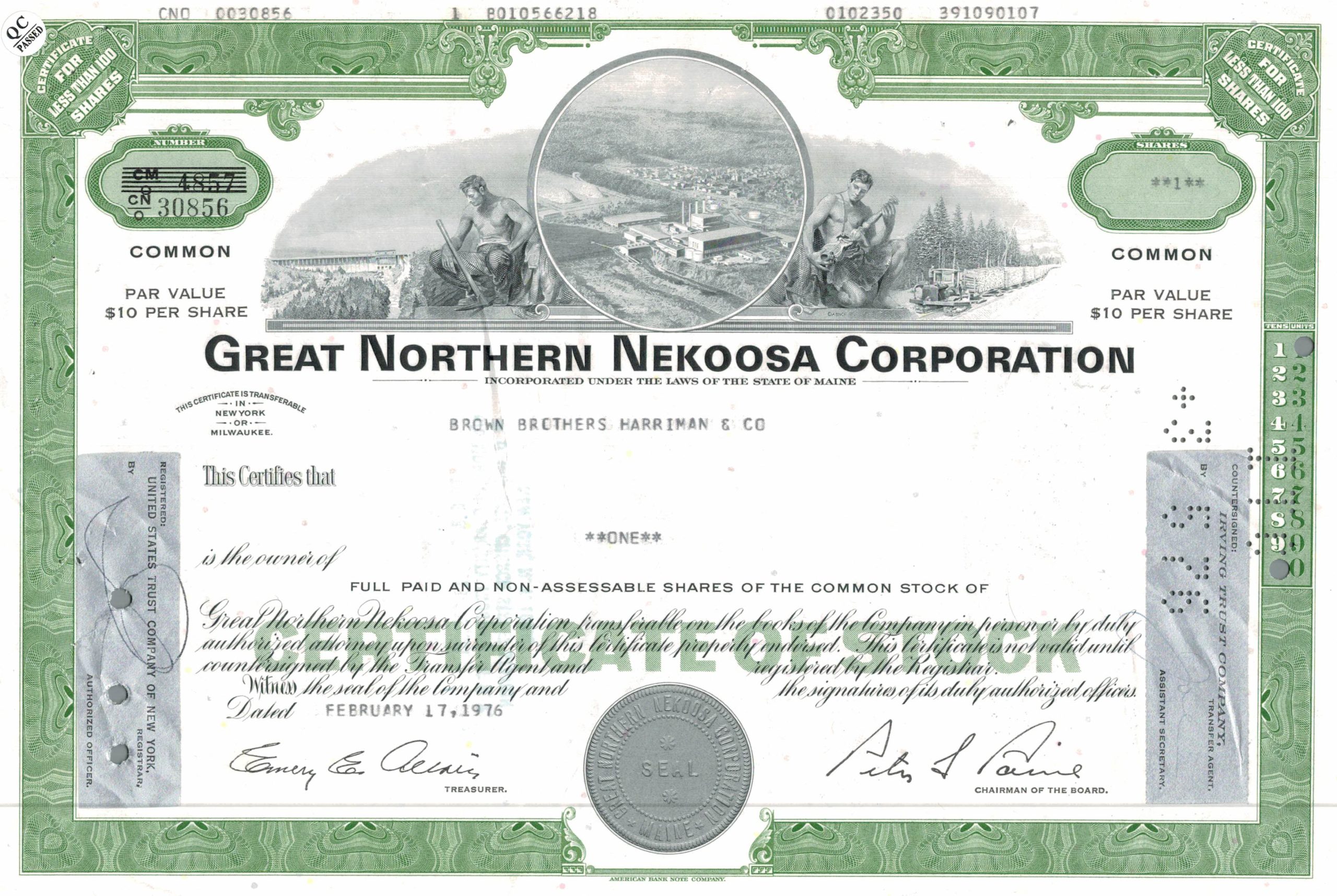 Great Northern Nekoosa Corporation Share Certificate 1976