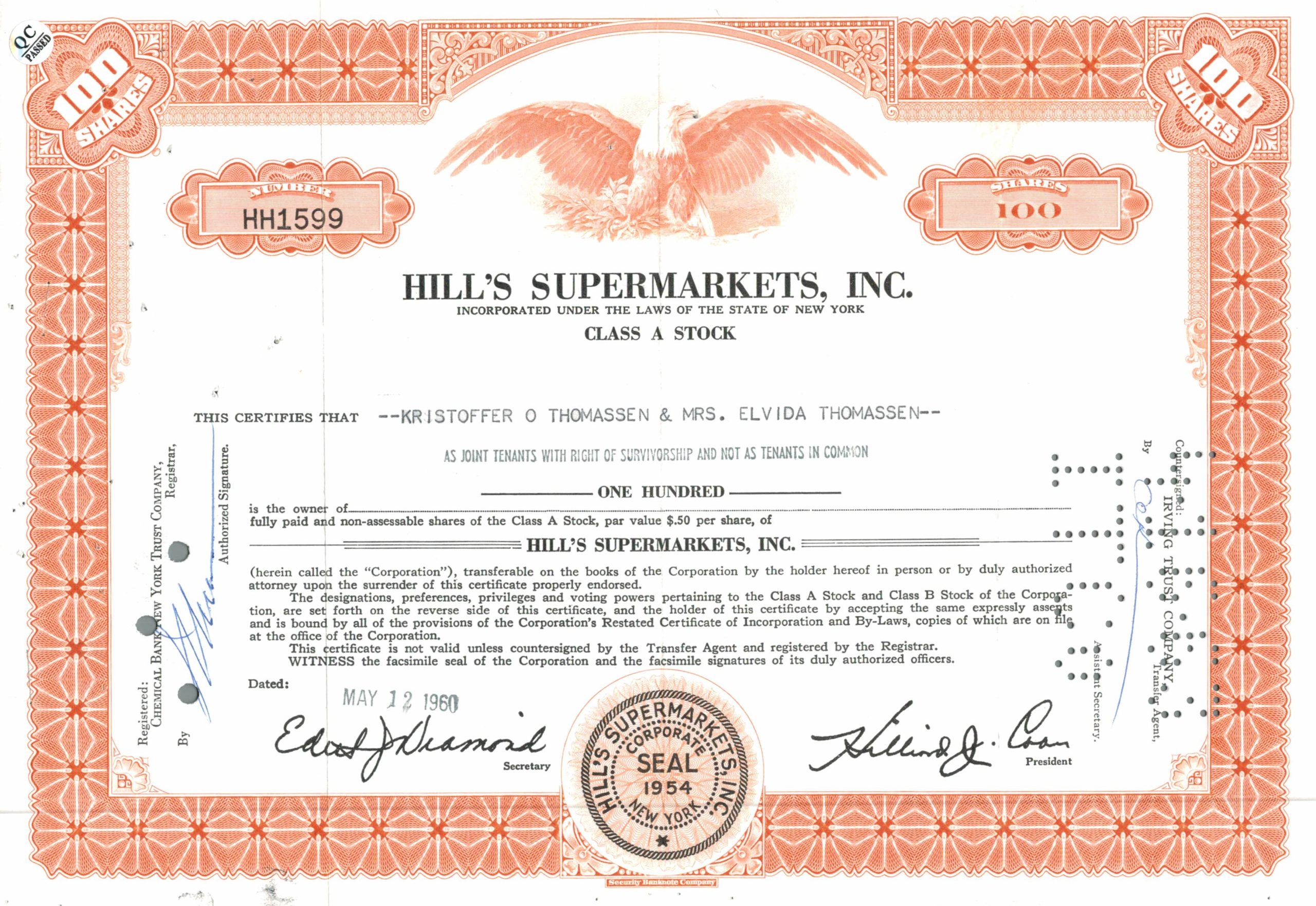 Issued to Kristoffer O. Thomassen and Mrs. Elvida Thomassen for one hundred Class A shares, this certificate was registered through The New York Trust Company. Incorporated under the laws of New York, Hill’s Supermarkets grew as part of the post-war boom in American consumer culture — a time when supermarket chains became symbols of modern living and economic optimism. The typography and engraving, typical of the period, were produced to inspire both credibility and aspiration, qualities mirrored in the company’s ambitious expansion during the 1950s and early 1960s.