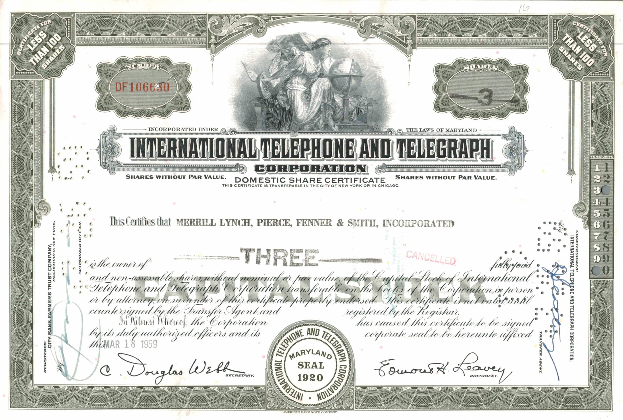International Telephone and Telegraph Corporation Share Certificate, 1959