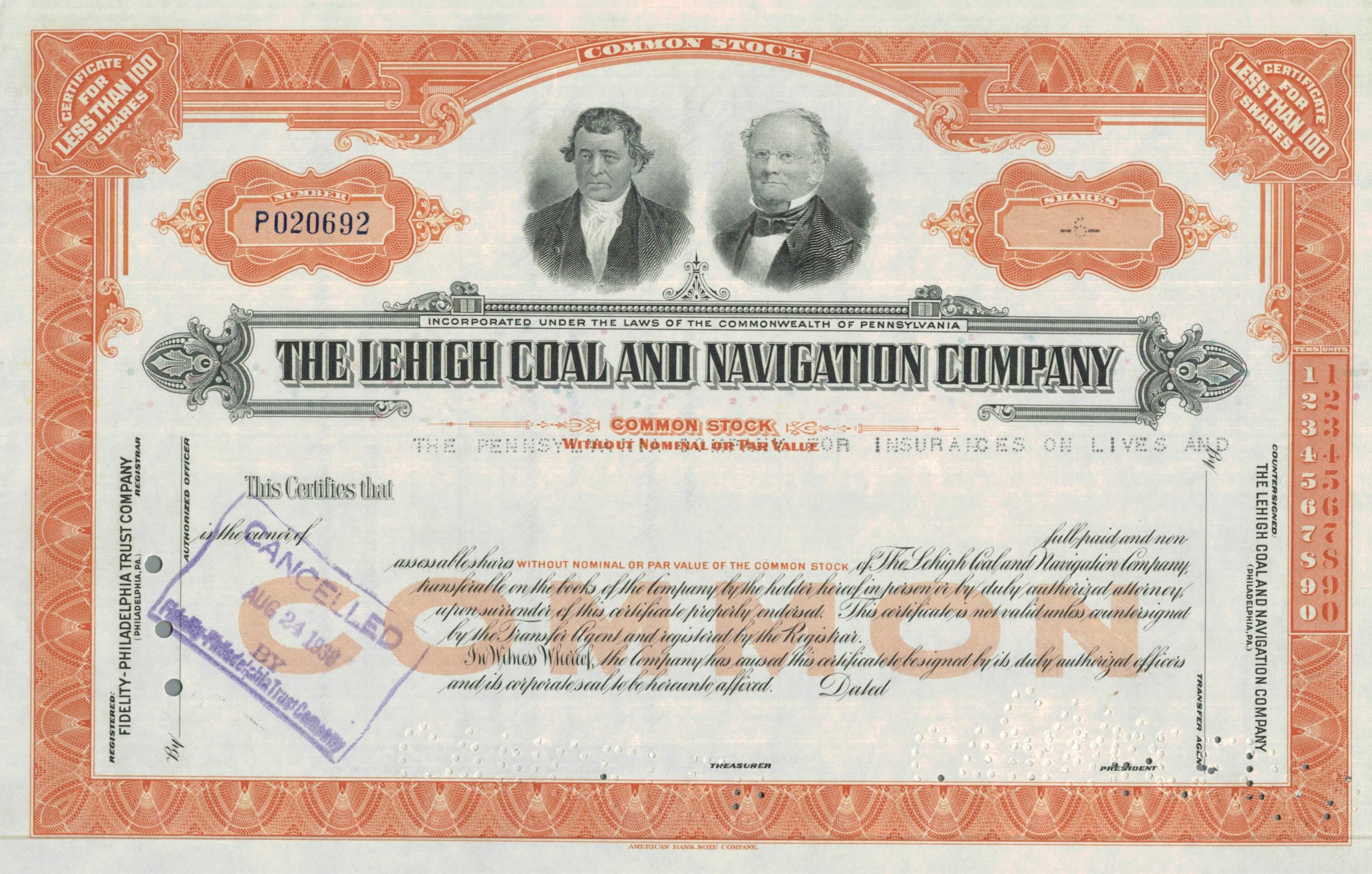 This certificate is defined by a vivid burnt-orange border framing a central panel engraved with the portraits of Josiah White and Erasmus Hazard, pioneers of early American industry. Issued under the laws of Pennsylvania, the certificate reflects the historic gravitas of one of the United States’ oldest mining and transportation companies. The distinctive “CANCELLED” handstamp dated August 24, 1938 confirms its decommissioned status while preserving the full visual narrative of ownership.