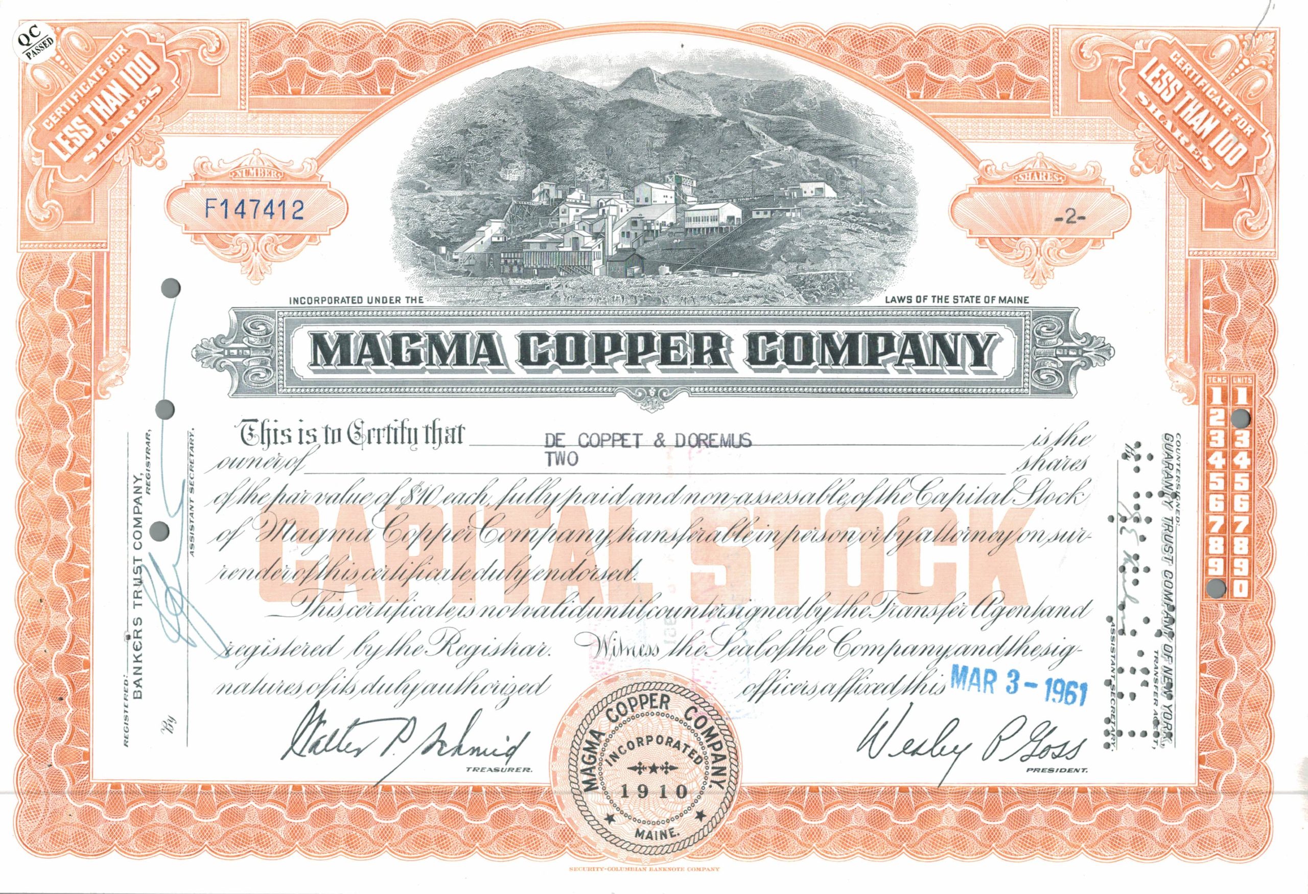 Original 1961 Magma Copper Company share certificate, issued to De Coppet & Doremus. A finely engraved artefact of American mining history, printed by Security-Columbian Banknote Company.