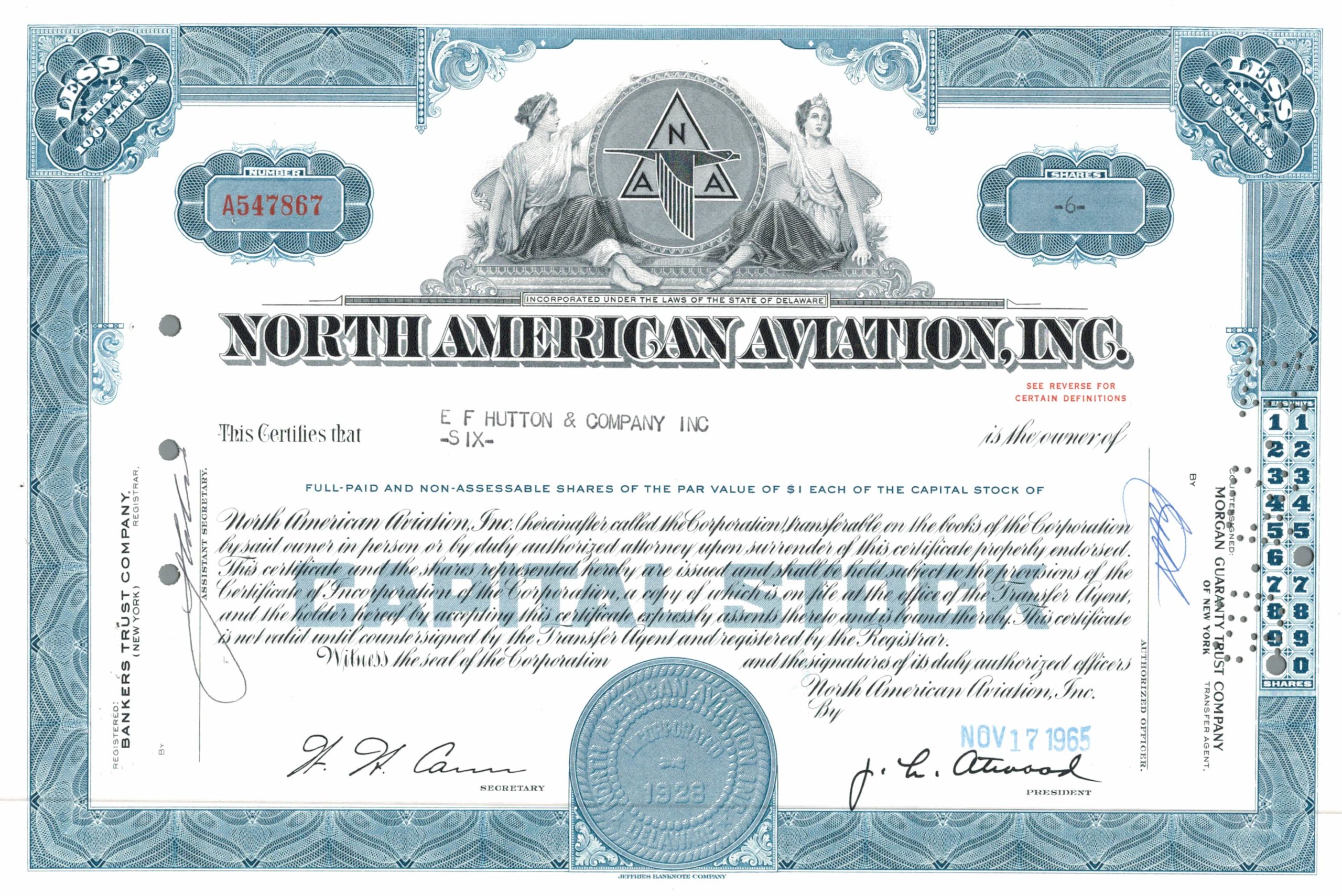 north american aviation, aerospace, share certificate, american bank note company, 1960s, aviation industry, scripophily, vintage ephemera, defence industry, stock certificate