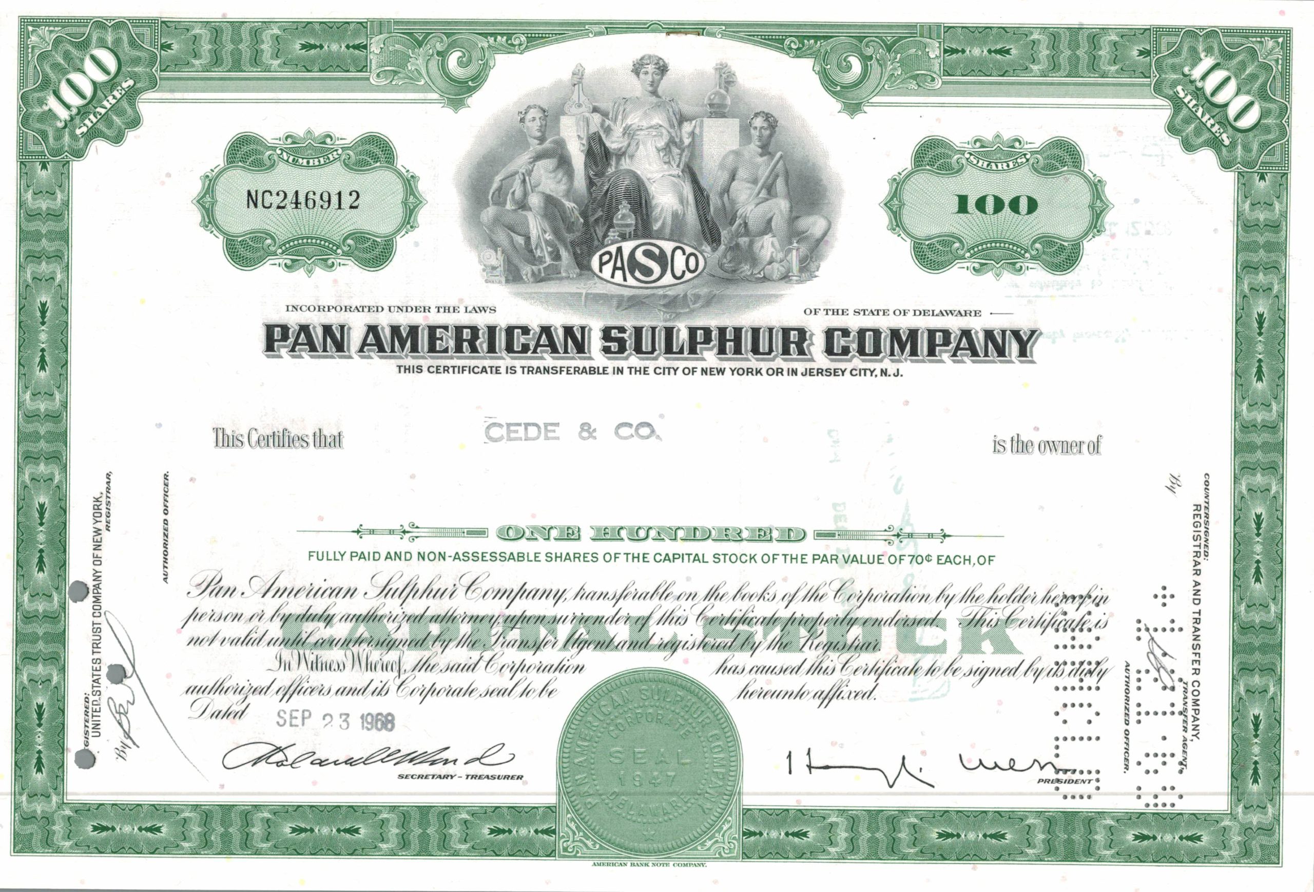 pan american sulphur, shares, mining, chemicals, 1960s, scripophily, delaware, finance, america, pasco, vintage, paper