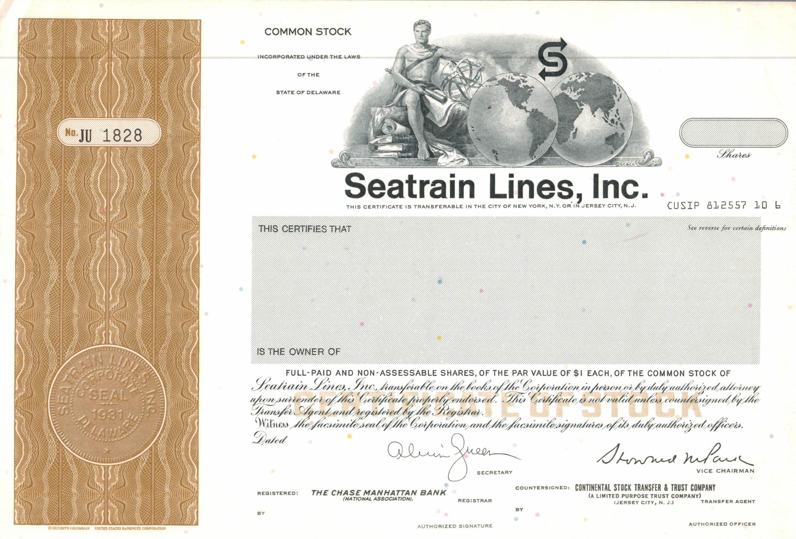 Incorporated under the laws of Delaware, Seatrain Lines pioneered containerised shipping, operating a hybrid model that combined railway freight cars and ocean transport. This certificate was registered by The Chase Manhattan Bank and countersigned by Continental Stock Transfer & Trust Company, underscoring the trust-based financial structure behind large-scale logistics operations of the mid-20th century. Issued with a $1 par value and printed by Security-Columbian United States Banknote Corporation, it reflects the high production values typical of industrial scrip.