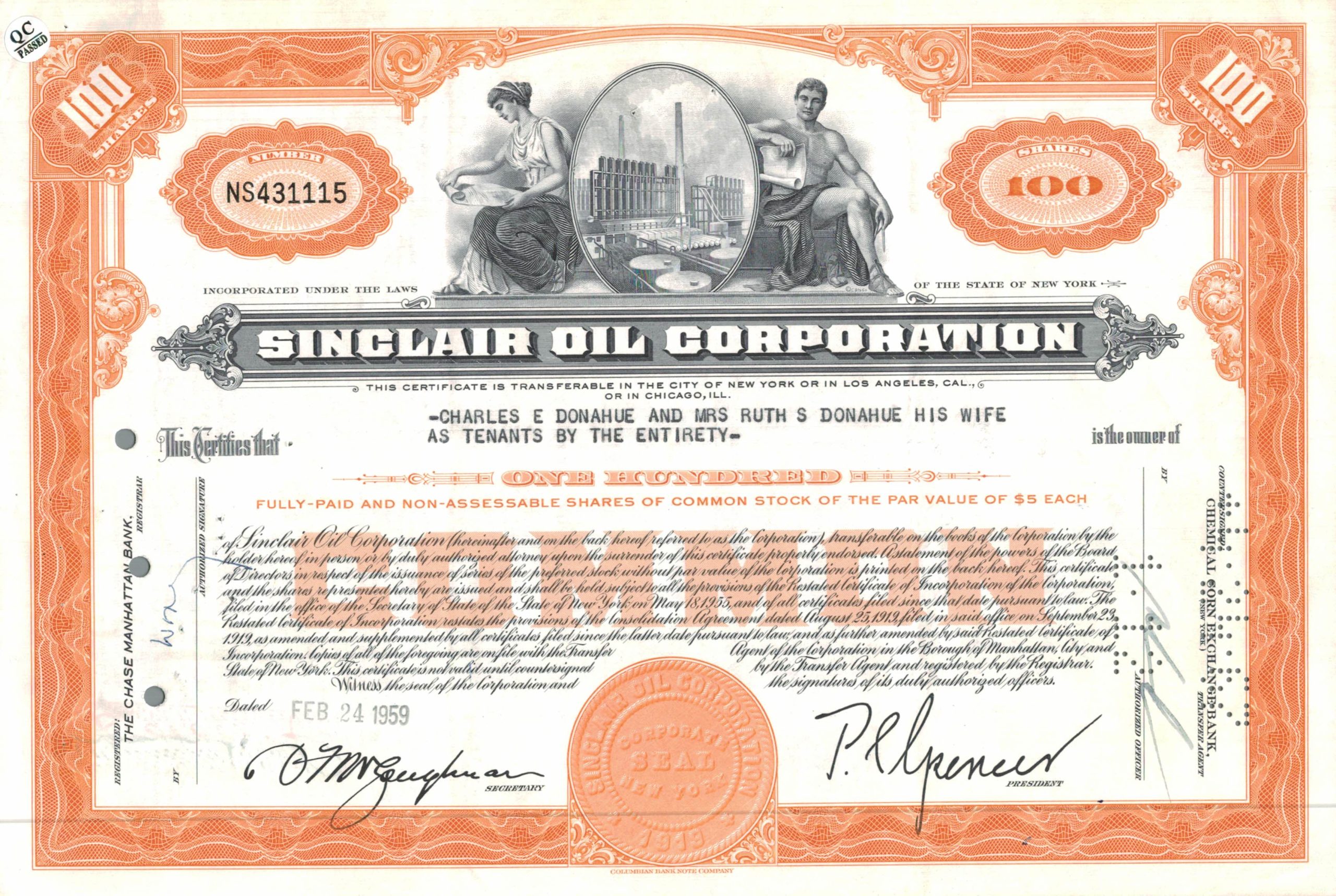 Original 1959 Sinclair Oil Corporation share certificate, issued to Charles E. Donahue and Mrs. Ruth S. Donahue. A beautifully engraved piece of American petroleum history featuring the iconic industrial vignette of Sinclair’s oil refinery.