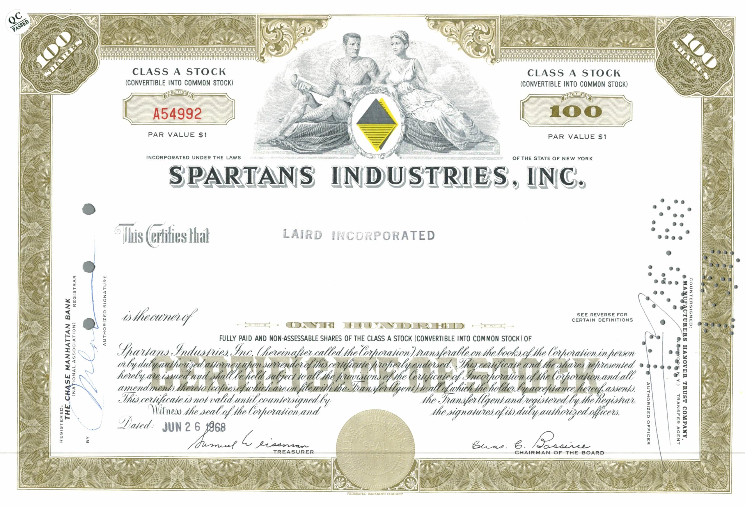 Spartans Industries Inc. Stock Certificate – Class A, 100 Shares, 1968