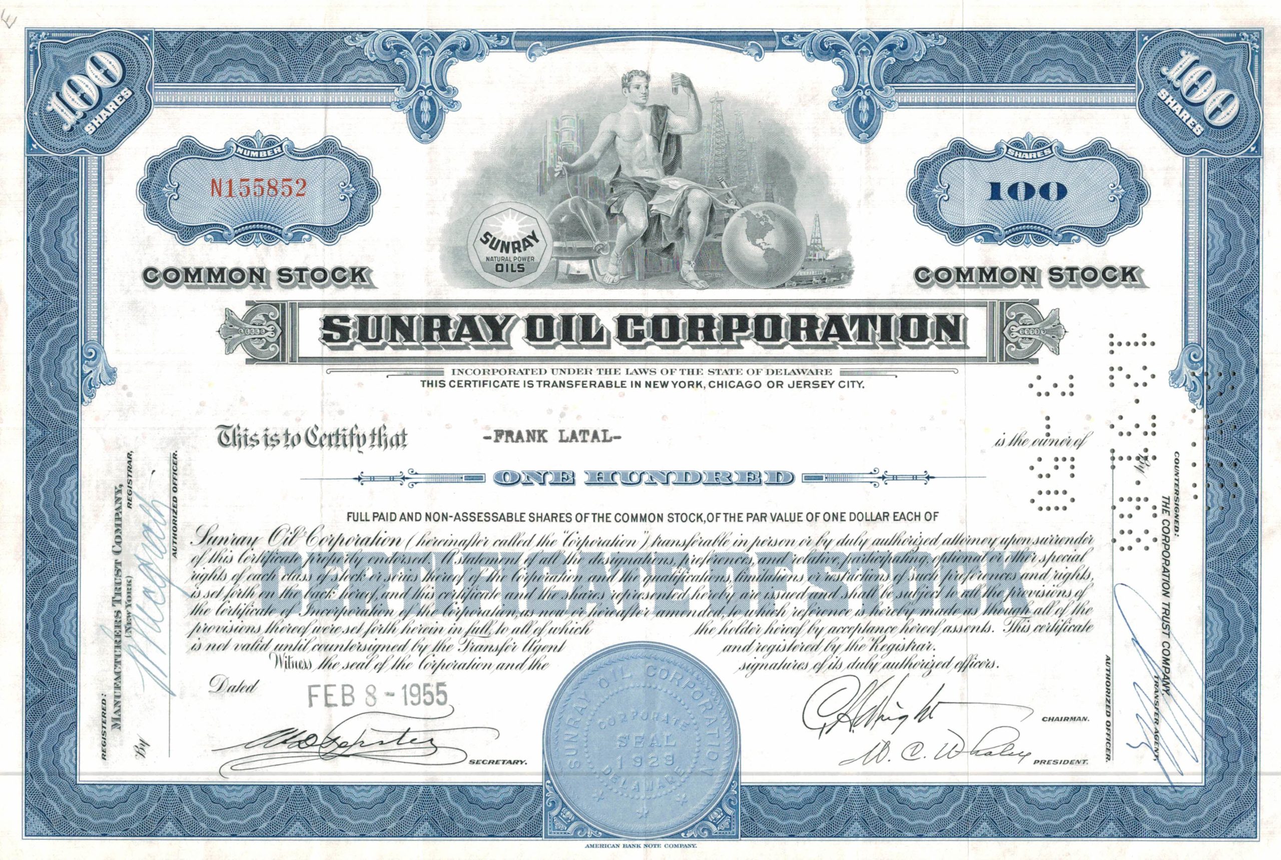 sunray oil, petroleum, share certificate, american bank note company, 1950s, oil industry, scripophily, vintage ephemera, industrial history, stock certificate