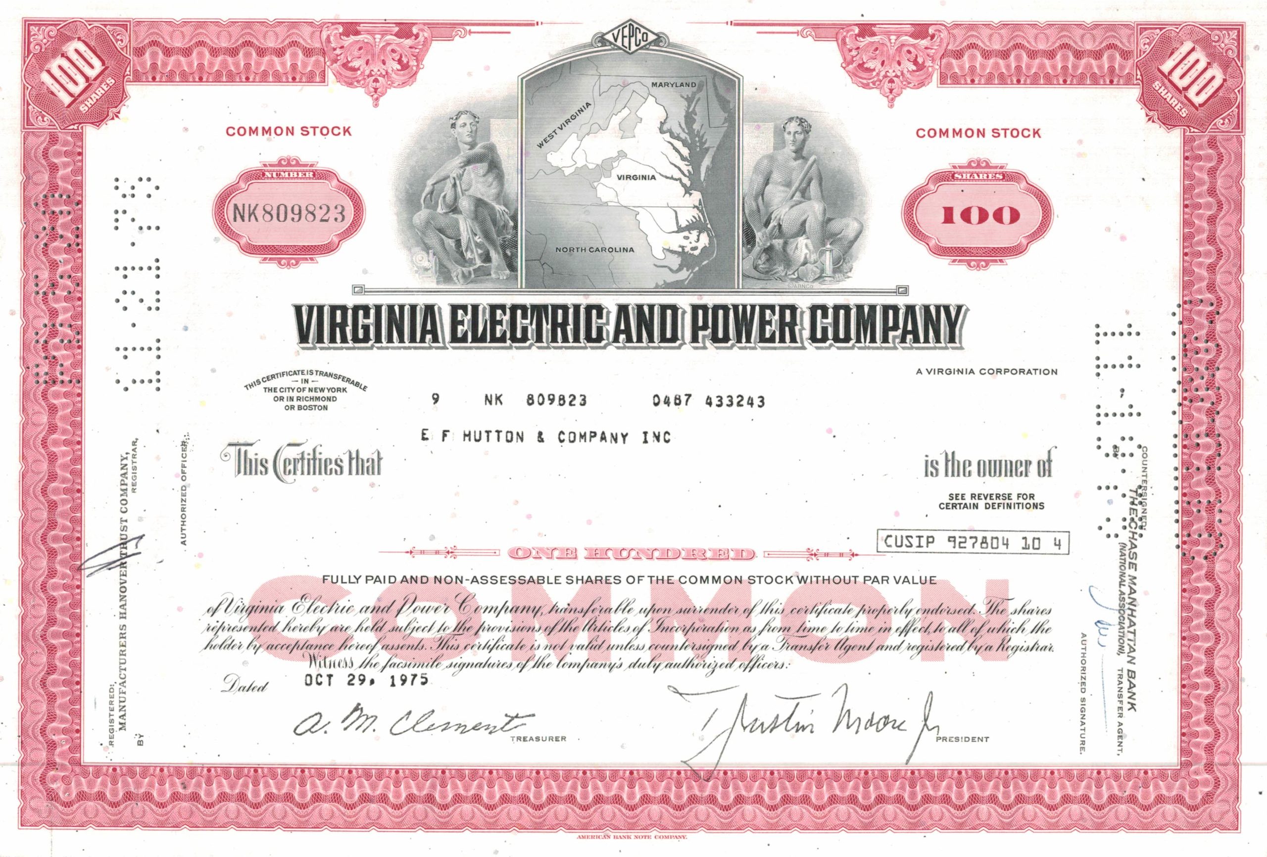 virginia, vepeco, power, electric, shares, scripophily, 1970s, cancelled, e.f. hutton, ephemera, american bank note, energy