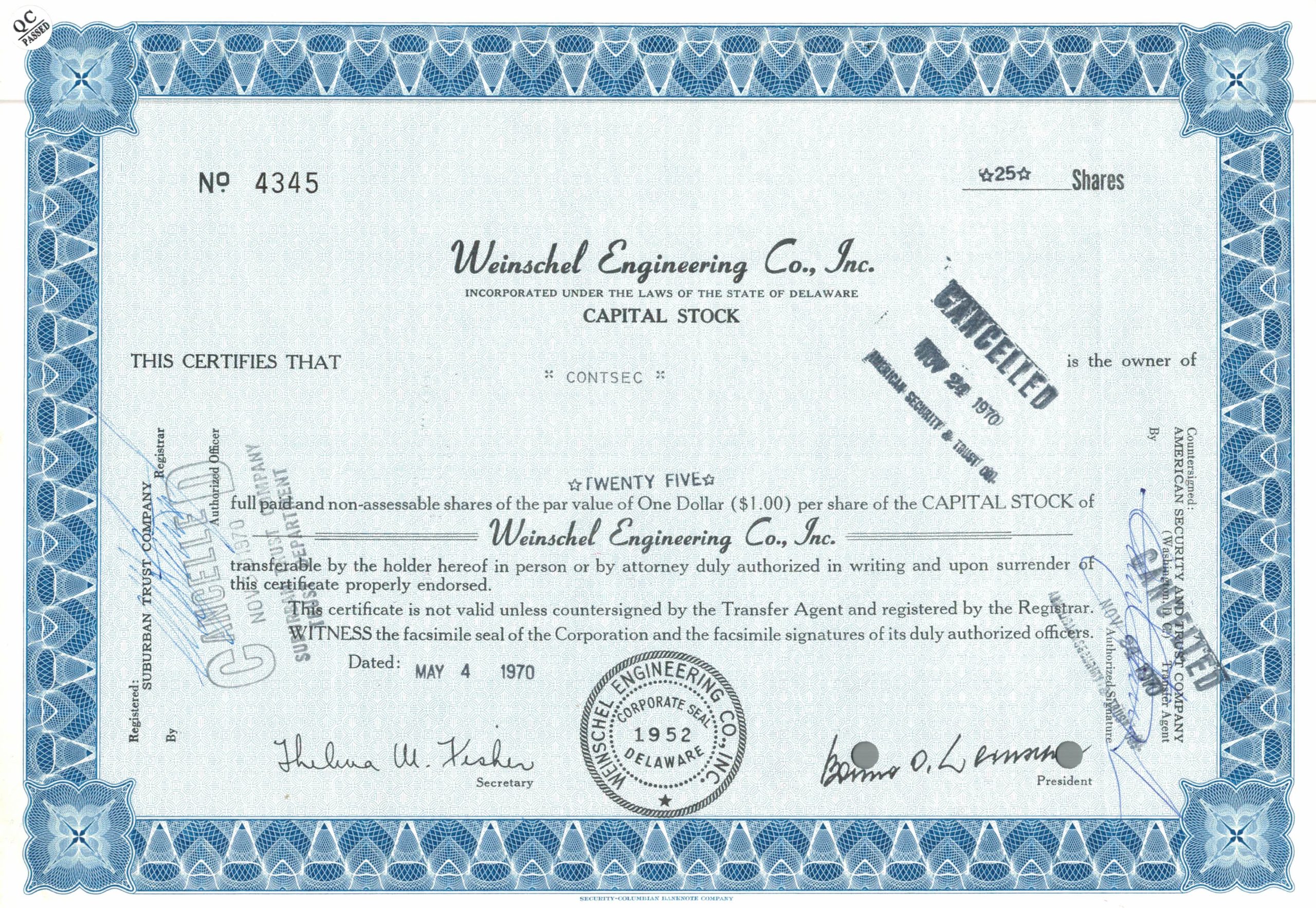 weinschel, 1970, stock, certificate, delaware, engineering, scripophily, aerospace