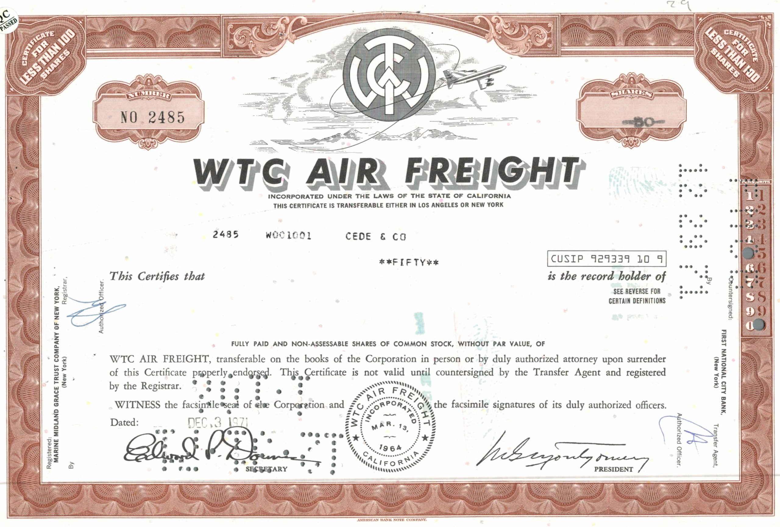 Step back into the high-flying optimism of the early 1970s, when air freight and global logistics symbolised modern progress and intercontinental connection. This original share certificate, dated December 3, 1971, represents the ambitions of WTC Air Freight Inc., incorporated in California during a time of rapid expansion in international cargo aviation.