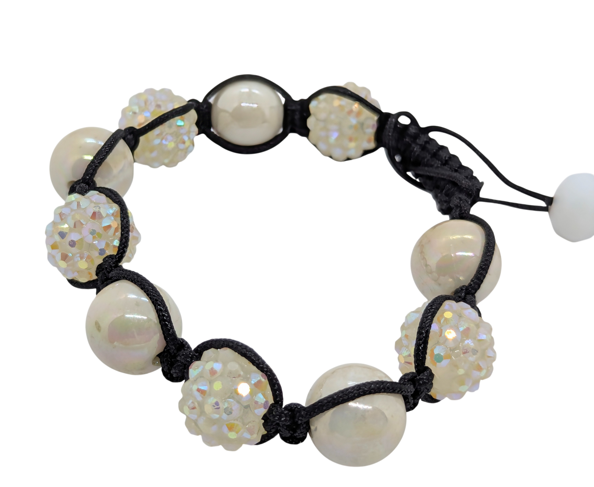 A charming adjustable bracelet combining faux pearls and iridescent crystal-effect beads, hand-knotted on black cord with a lustrous finish that catches the light beautifully.