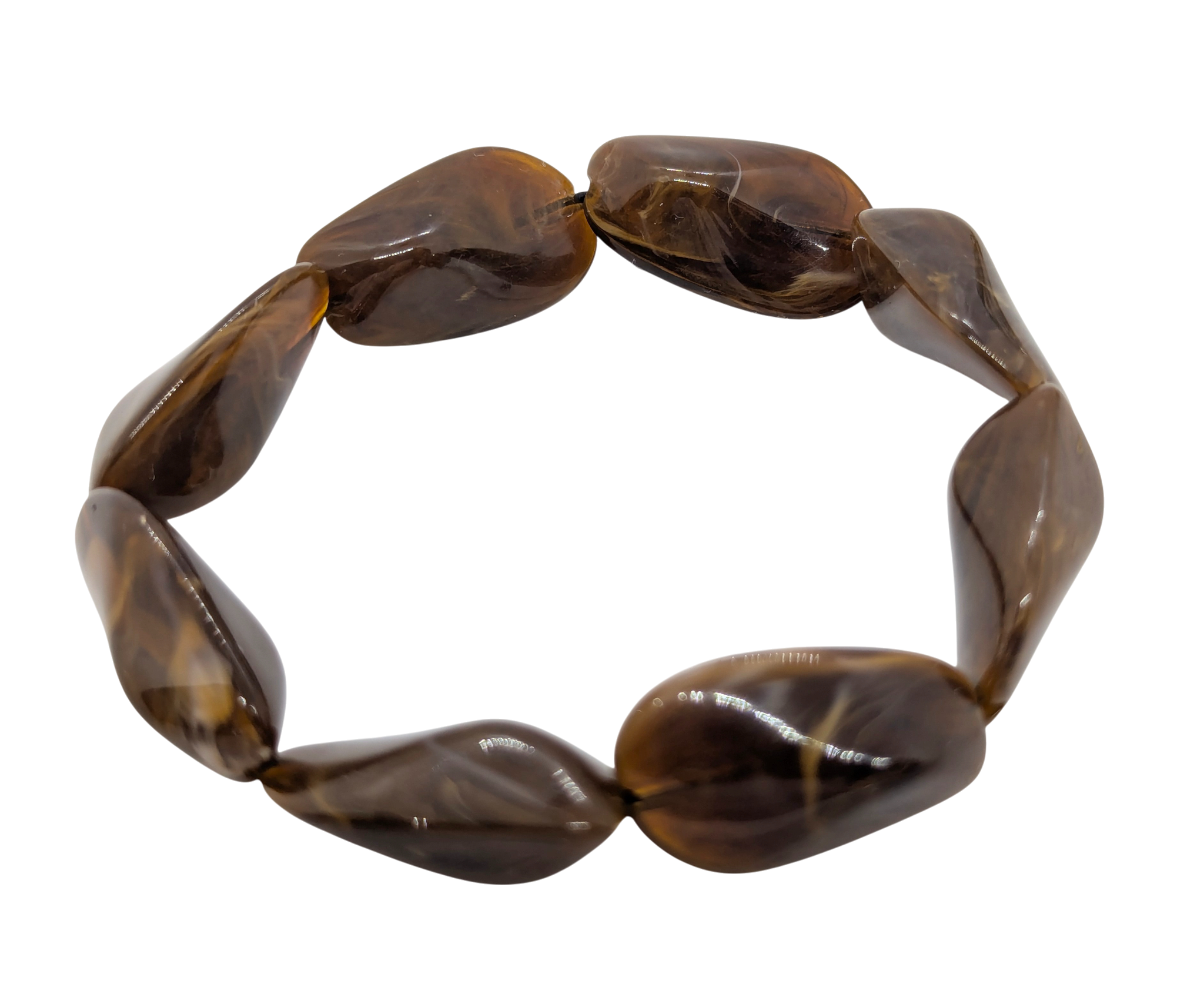 A timeless vintage stretch bracelet featuring smoothly twisted brown resin beads with natural marbled tones, evoking the warmth of polished stone and the elegance of 1970s jewellery design.