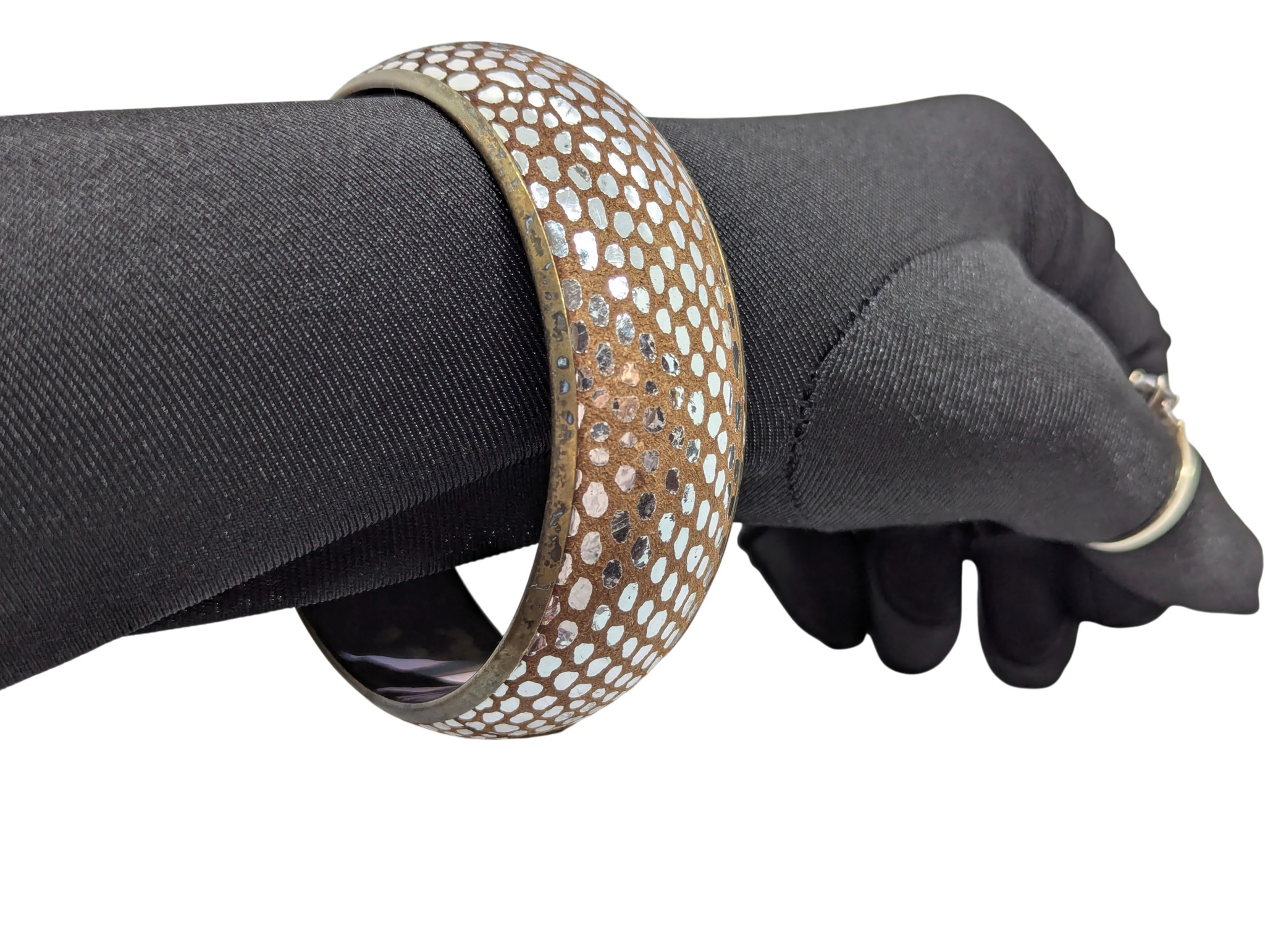 A beautifully tactile vintage statement bangle blending natural cork with a luminous foil mosaic. Its earthy texture and metallic shimmer capture the effortless glamour of 1970s boho-chic design — where organic materials met bold, sculptural style.