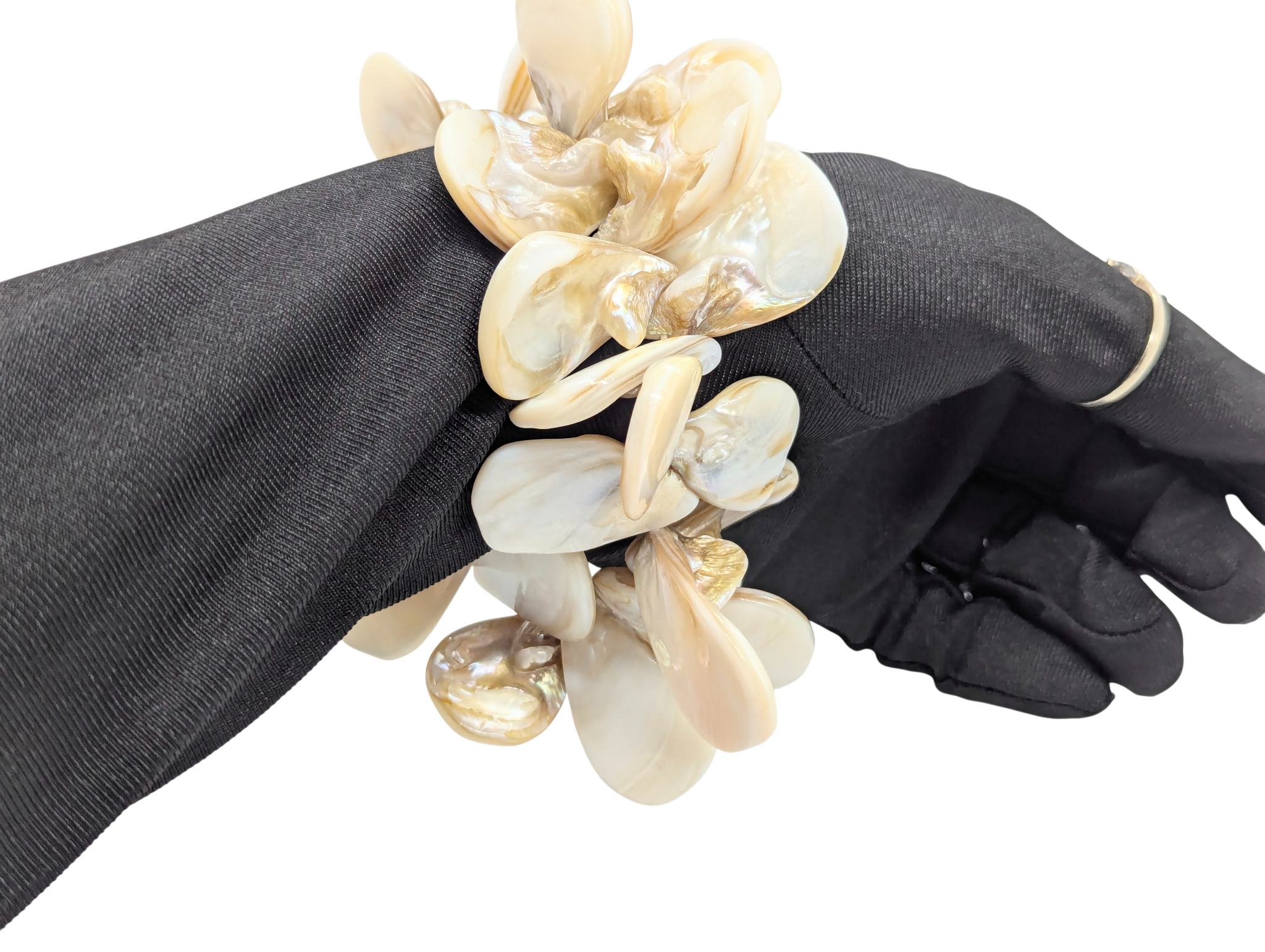 This vintage cluster bracelet celebrates the tactile elegance of natural materials shaped by hand. Each curved and layered piece of mother-of-pearl reflects soft champagne, cream, and opaline tones, recalling sunlight on the shoreline. The irregular arrangement creates a striking three-dimensional form that moves with light and texture — a wearable piece of coastal artistry.
