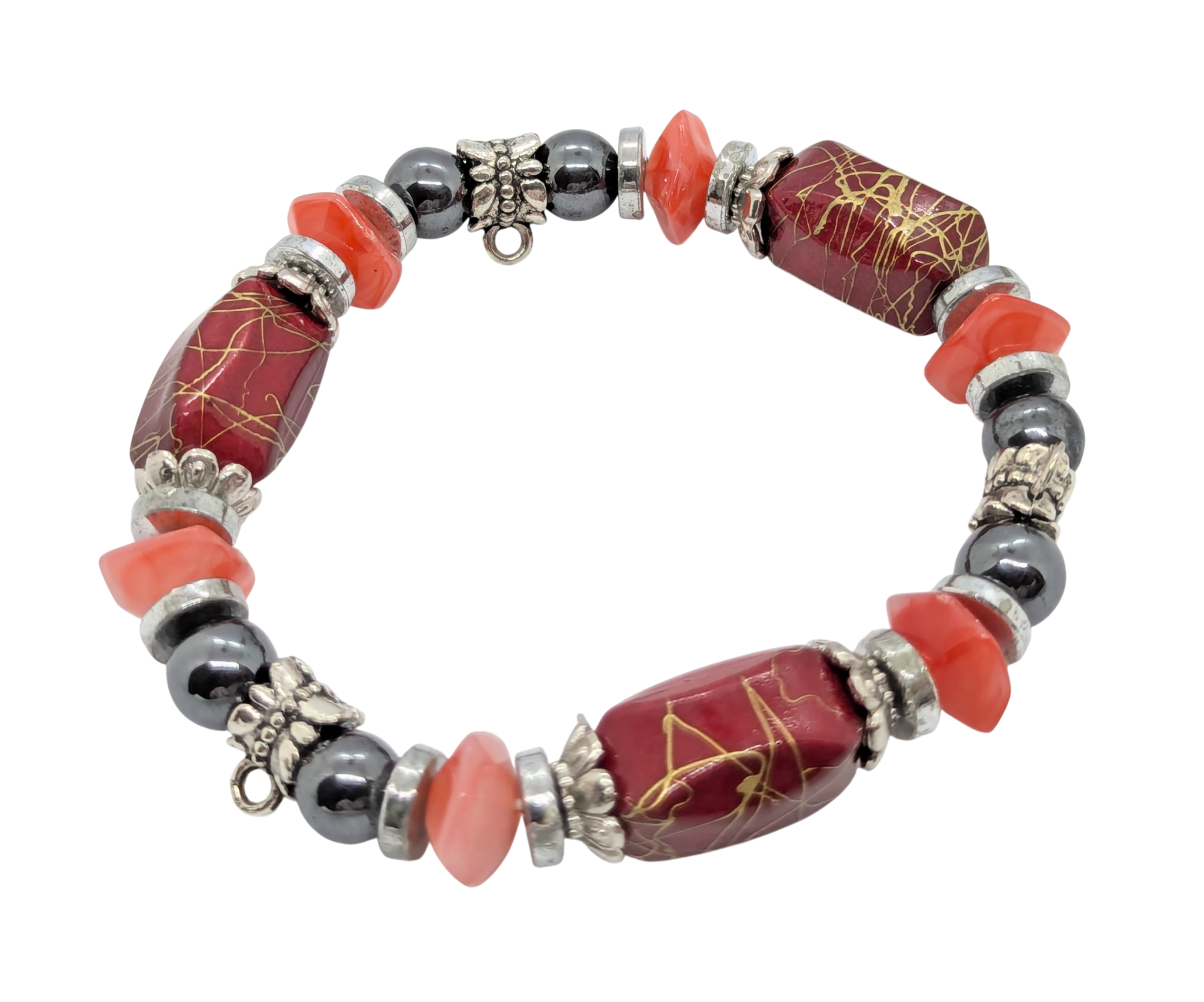 A striking vintage stretch bracelet featuring deep red faux stone beads with gold veining, accented by silver-tone spacers and hematite-effect beads — an elegant fusion of earthy warmth and metallic sheen.